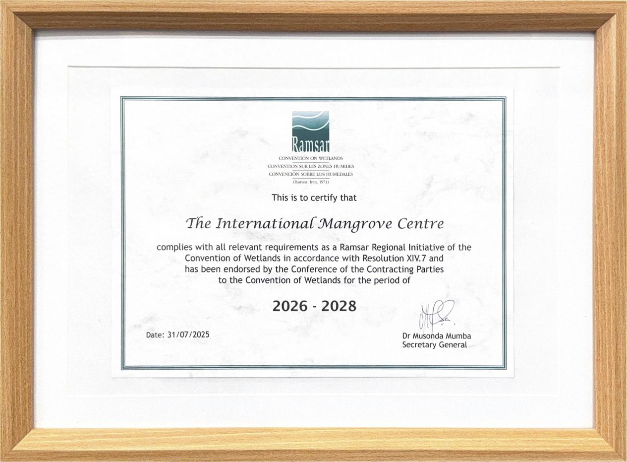 On July 31, 2025, during the 15th Meeting of the Conference of the Contracting Parties (COP15) to the Ramsar Convention, the International Mangrove Center (IMC) was officially endorsed as a Ramsar Regional Initiative (RRI) for the period of 2026-2028. The certificate confirms that the IMC complies with all relevant requirements as a Ramsar Regional Initiative in accordance with Resolution XIV.7 and has been endorsed by the Conference of the Contracting Parties.