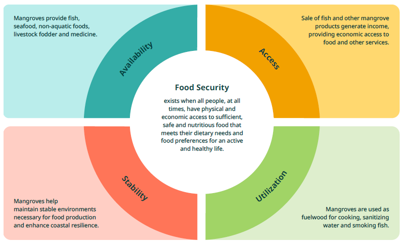 Figure 1: The many ways in which mangroves contribute to the four dimensions of food security.